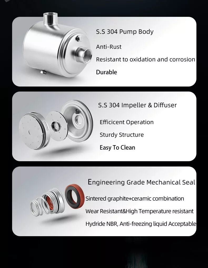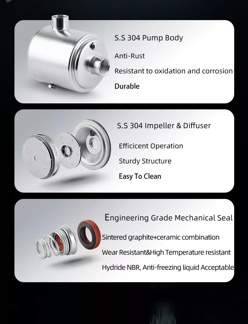 3. Vielseitige Anwendungen: Ob Sie den Wasserdruck in Gebäuden, Bewässerungssystemen oder industriellen Prozessen erhöhen müssen, diese Pumpe ist vielseitig genug, um eine Vielzahl von Anforderungen problemlos zu erfüllen.