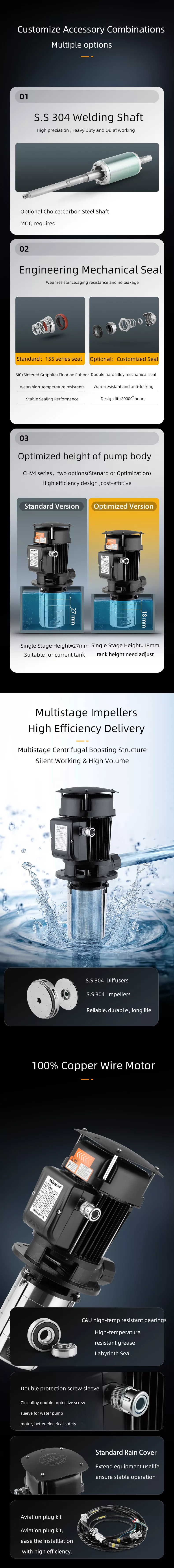 Im Folgenden finden Sie eine Einführung in die CHV-Serie. Die mehrstufige Tauchkreiselpumpe CHV, auch Tauchpumpe oder Maschinenpumpe genannt, wird für die Förderung von Kühl- und Schmiermitteln für Werkzeugmaschinen, für die Übertragung von Kondensatwasser, für industrielle Reinigungsgeräte, Filtersysteme und andere Anwendungen verwendet, die für den Einsatz als Tauchpumpe geeignet sind. Es ist ideal für die Integration mit Werkzeugmaschinen, Schleifmaschinen, CNC-Bearbeitungszentren, Erodiermaschinen, industriellen Reinigungsmaschinen und anderen Geräten.